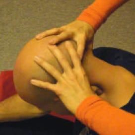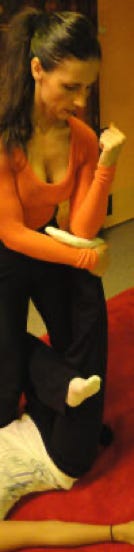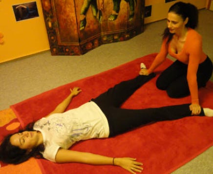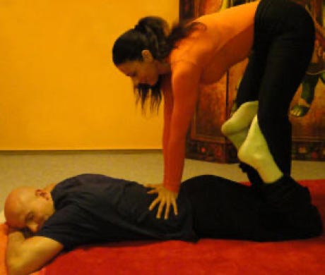 Hier werden die Energielinien (Sen Linien) und seine Muskulatur mit Handballen, Daumen, Faust, Knie, Ellenbogen und Füßen bearbeitet.